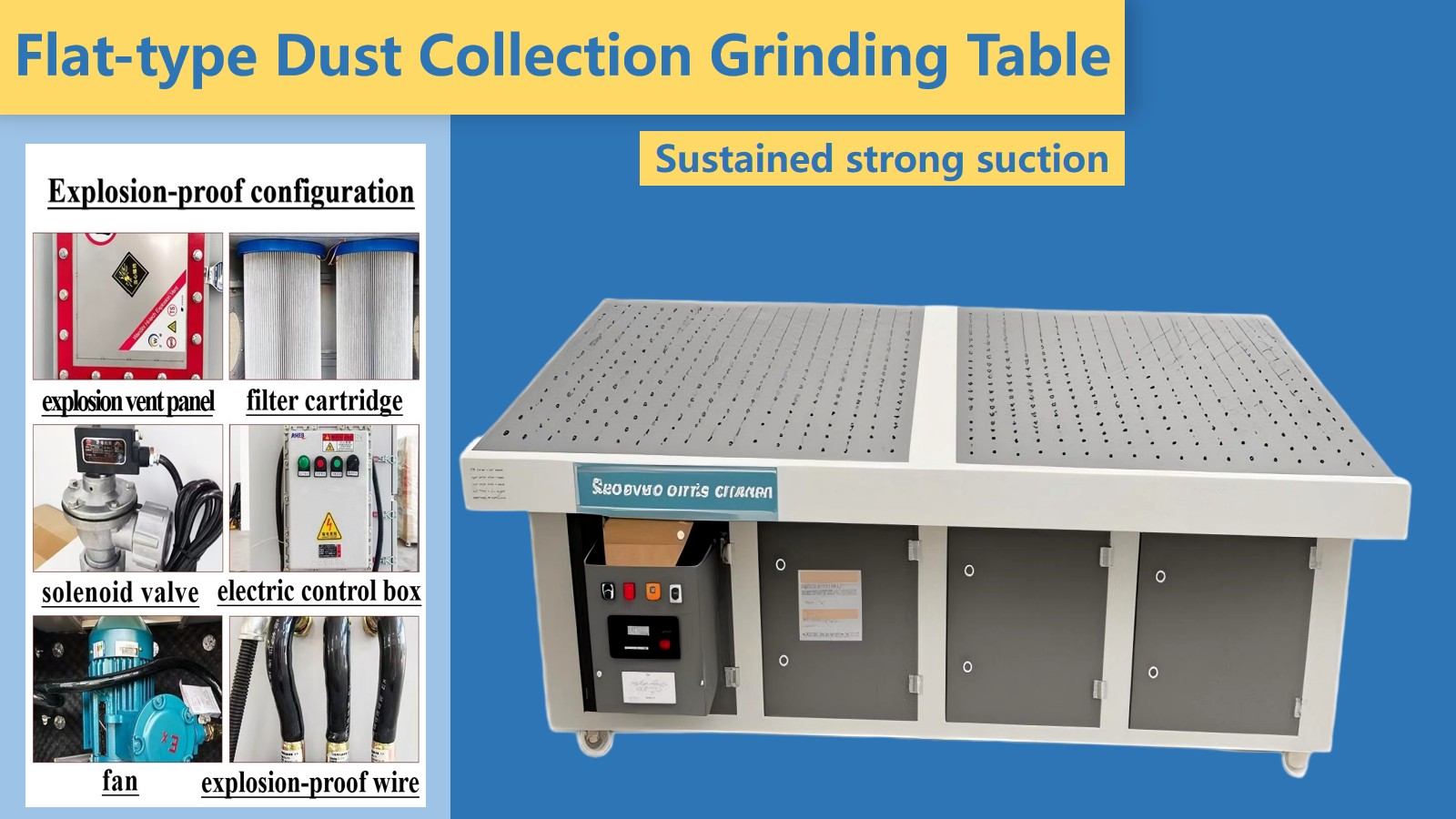 Ramah lingkungan dan efisien: Meja pengamplasan datar yang menyerap debu dapat menghilangkan debu pada sumber penggilingan, mengontrol penyebaran debu secara efektif, dan mengurangi polusi debu terhadap lingkungan dan membahayakan kesehatan operator.